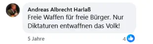 Zitat: „Freie Waffen für freie Bürger. Nur Diktaturen entwaffnen das Volk!“Dafür habe ich meinen Daumen nach oben gegeben. Geil! Jedem Meißner seine halbautomatische Kalaschnikow.Apropos Demokratie und so. Den Verein „Buntes Meißen“ habe ich schön reingeritten. Erst Fördermittelkürzung, nun aktuell im Compact-Video mit einer Lüge schlecht geredet bzw. nicht gegen diese Lüge interveniert. In Riesa waren die bei gar keiner Sitzblockade beim AfD Parteitag sondern hatten einen Infostand an der WT Energiesysteme Arena. Aber der Pöbel glaubt eher mir als diesem Pfaffen… ähm evangelischen Pfarrer Bernd Oehler. Ich Chef, ich Rocker, ich reicher Unternehmer der die Leute schmiert… ähm Geld spendet.Hahaha