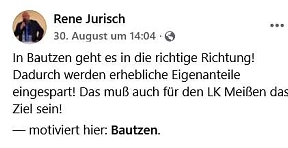 Anmerkung:Sie finden diesen Brief unter aller Sau? Wir auch. Deshalb haben wir diesen fiktiven Brief entworfen der unsere Meinung zum Thema aufzeigt. Der Text enthält eine Vielzahl von realen Aussagen und Veröffentlichungen auf sozialen Medienmit Jurischs Gedankengut. Die AfD hofiert einen ehemaligen (?) Neonazi zum Oberbürgermeister. Ein ehemaliges Mitglied der NPD, einen ehemaligen Vorsitzenden des „Verein zur germanischen Brauchtumspflege - Schwarze Sonne Meißen e.V.“ Im NPD-Verbotsverfahren hieß es zu diesem Verein unter anderem, Zitat:„Das Aufnahmeverfahren in die Kameradschaft soll in Anlehnung an die Erfahrungen der Kameradschaft "Skinheads Sächsische Schweiz" (SSS) erfolgen.“Die SSS war eine extrem gewaltbereite, neonazistische Gruppierung.Geblieben von Jurischs damaliger (?) neonazistischer und heute mindestens rassistischer,rechsextremistischer Gesinnung ist in unseren Augen viel. Er hofiert Rechtsextremisten und die ihn. Er lässt zu, dass rassistische Videos unwidersprochen stehen bleiben - bewirbt diese sogar. Er versucht demokratische Projekte zu sabotieren, inszeniert sich auf Facebook fast täglich als großer „Gönner und Macher“. Kriegsverbrecher, Wehrmacht und das Dritte Reich verherrlichte er. Wollen Sie wieder etwas Nationalsozialismus wagen?Meißen ist eine bunte, vielfältige, reiche, lebenswerte Stadt. Hat Meißen einen Ex(?)-Neonazi und aktiven Rechtsextremisten, welcher für eine rechtsextreme Partei antritt, welcher sich fast täglich auf Facebook inszeniert, als Oberbürgermeister verdient?Die Würde des Menschen, sie ist wieder antastbar?weitere, thematische PresseartikelWie die AfD einen Neonazi … >>> LinkEhemaliges NPD Mitglied… >>> LinkIn Meißen will ein Neonazi >>> LinkAfD-Kandidat René Jurisch >>> LinkSchmucke Fassaden, großer Frust > Link