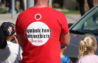 Neonazizeitschrift „NS Heute“ ein Interview gab, trug ein T-Shirt mit einem Bekenntnis zur verurteilten Holocaust-