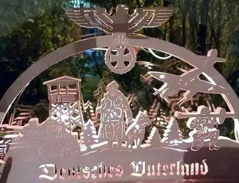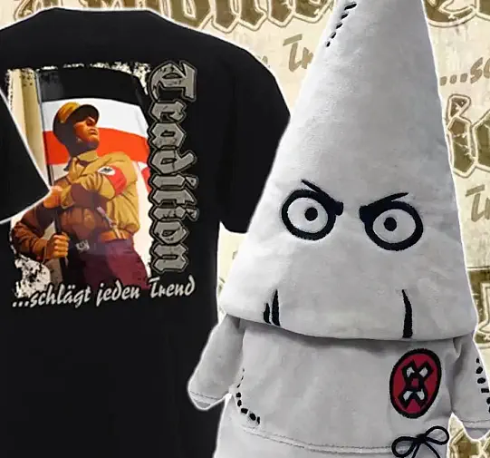 •1 Wachtturm (ähnlich KZ-Wachturm)•1 Soldat der Wehrmacht mit Panzerfaust•1 Kampfpanzer Tiger der Wehrmacht•1 Sturzkampfbomber•Reichsadler und Schriftzug „Deutsches Vaterland“Da kann ich Dir Geschichten erzählen. Als unsere Großväter in Afrika, Russland, Polen, Frankreich etc. pp. einmarschiert sind. Der Kampf um Stalingrad! KZ Buchenwald… Da wird Weihnachten richtig heimelig.Wenn Du noch keinen Schwibbogen hast - bei Tommy Frenck gibts die aktuell für knapp 90 € in veränderter Form - mit Adolf Hitler, Schäferhund Blondi und V2 - Rakete. T-Shirts in Anlehnung an die menschenverachtende, brutale Sturmabteilung SA der NSDAP kannst Du dort ebenso kaufen wie diese Werbung in Klu-Klux-Klan Optik.