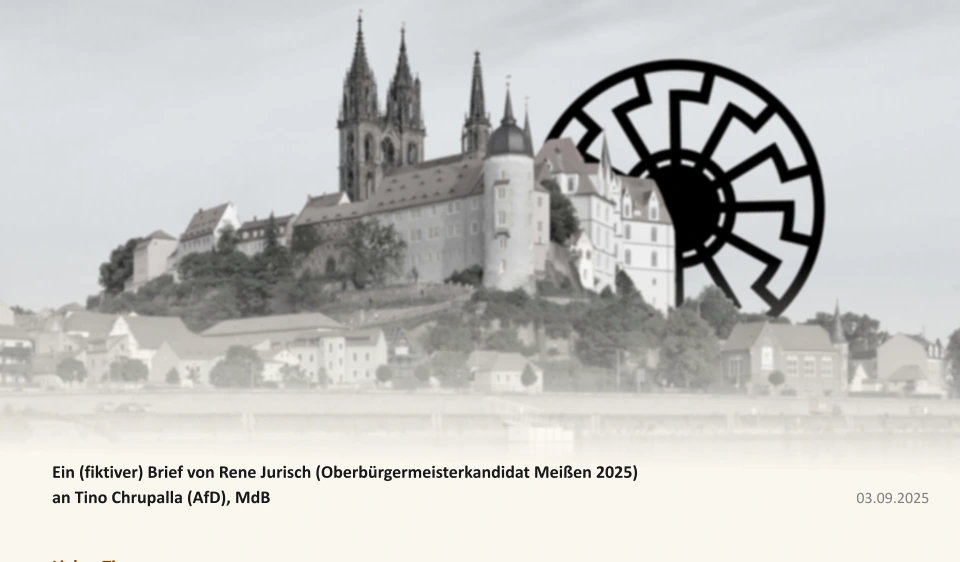Ein (fiktiver) Brief von Rene Jurisch (Oberbürgermeisterkandidat Meißen 2025) an Tino Chrupalla (AfD), MdB 03.09.2025Lieber Tinoschön, dass Du mich in meinen Bemühungen unterstützt, Oberbürgermeister von Meißen zu werden. Dann auch die Abgeordnetenvom EU Parlament der AfD Mary Khan und Alexander Jungbluth. Was macht ihr da überhaupt? Ich dachte, ihr wolltet die EU abschaffen, sitzt aber selbst im Parlament? Bestimmt wegen der Kohle. ;-)