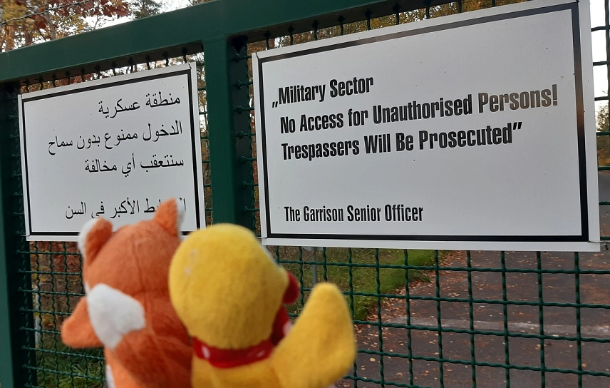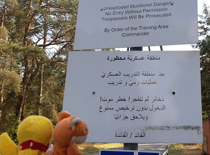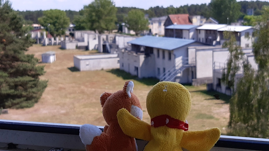 Schnatti: „Aaaaah. Hier möchte ich wohnen! Ein wunderschönes kleines Dorf mit allem was man braucht: Supermarkt, Apotheke, Reisebüro,Uhrenladen - ja sogar sogar mit Bahnhof, Flugplatz und S-Bahn!“Fuchs: „Hier können wir nicht wohnen. Das ist ein militärisches Übungsdorf für den Orts- und Häuserkampf. Hier wird scharf geschossen.“Schnatti: „Verstehe. Deshalb steht dort vorn der zerschossene Reisebus und hier hinten die alten Panzer. Schade. Nag nag nag“