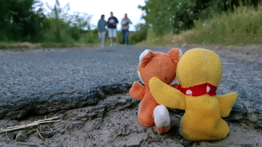 Schnatti: „Aaaaah. Hier möchte ich wohnen! Ein wunderschönes kleines Dorf mit allem was man braucht: Supermarkt, Apotheke, Reisebüro, Uhrenladen - ja sogar sogar mit Bahnhof, Flugplatz und S-Bahn!“Fuchs: „Hier können wir nicht wohnen. Das ist ein militärisches Übungsdorf für den Orts- und Häuserkampf. Hier wird scharf geschossen.“Schnatti: „Verstehe. Deshalb steht dort vorn der zerschossene Reisebus und hier hinten die alten Panzer. Schade. Nag nag nag“